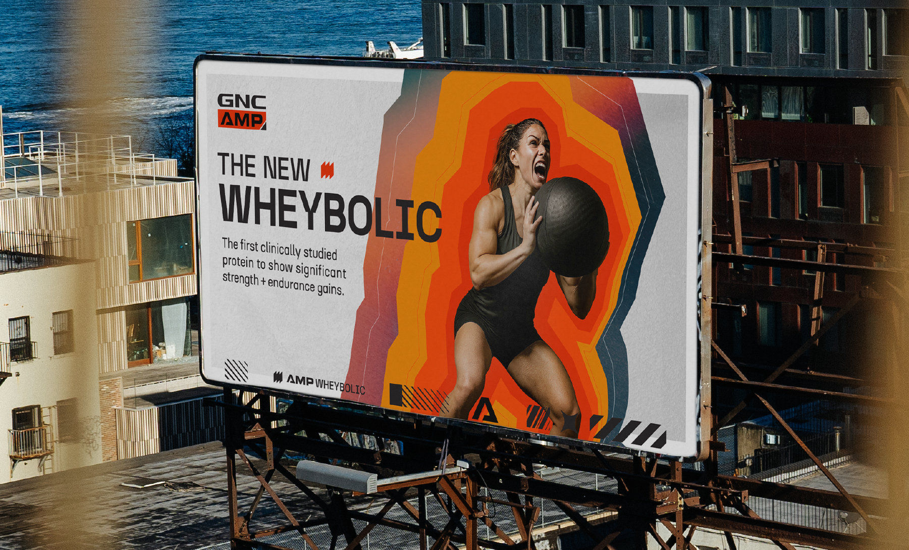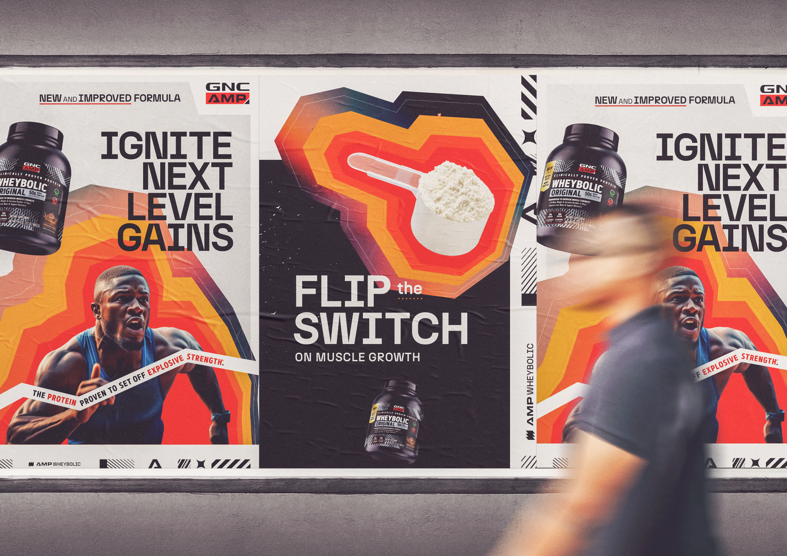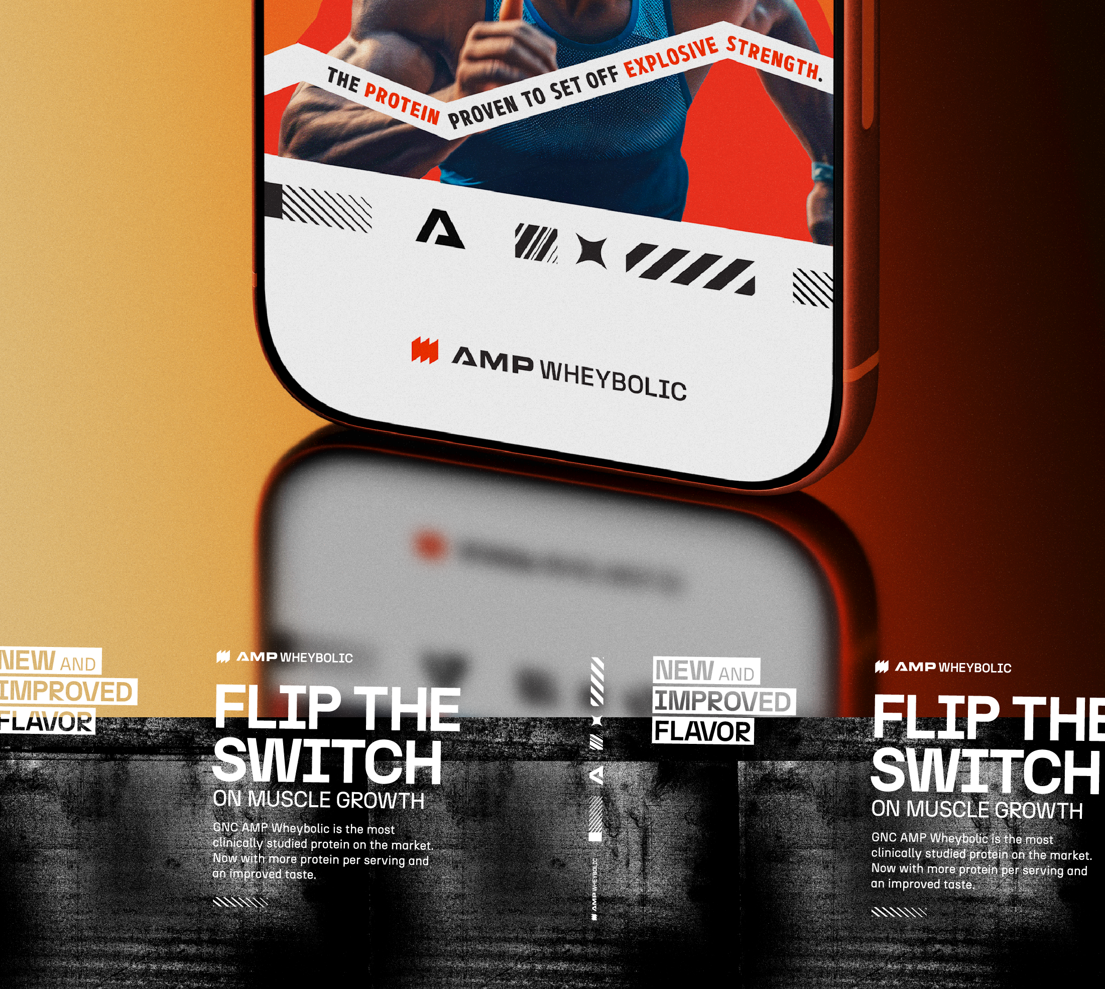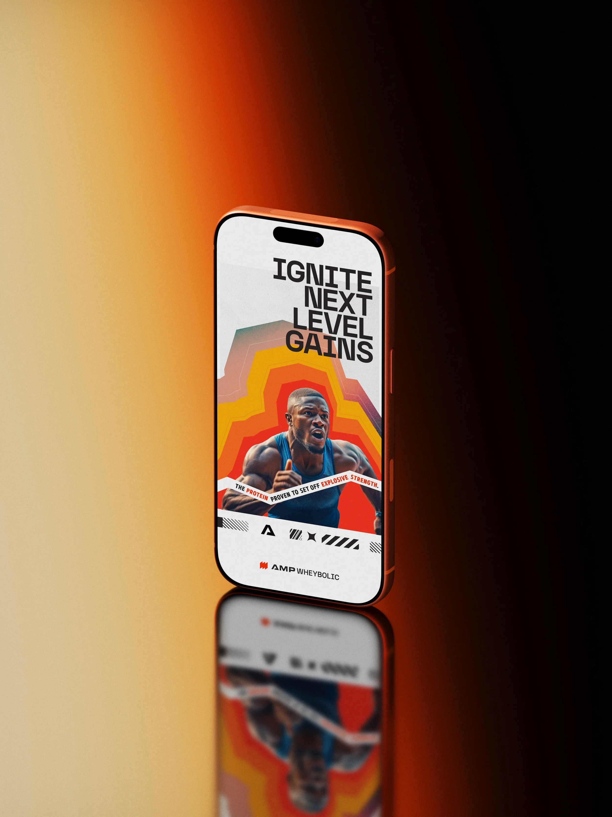 For the new & improved AMP Wheybolic 2.0 protein, we took legacy packaging and modernized it with a campaign influenced by various tech, niche Japanese running brands, the Artemis II launch, Nike ACG and EDM/house album graphics.